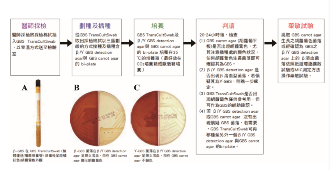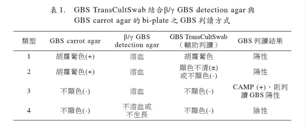 broth需額外插入加強顯色紙條,因 此 GBS TransCultSwab的操作堪稱簡易、方 便與親民(user friendly)。另外,GBS Trans CultSwab移種的分隔平板中GBS carrot agar 偵測 -溶血型GBS的特異性高達100%[11], 因此,任何橘~紅色的生長菌落可借著顯色特征快速檢出GBS。GBS除了 -溶血型外, 尚有3~5%屬于非( )溶血型[3],此可藉者分 隔平板的 / GBS detection agar快速偵測, 因此,檢測套組對GBS的偵測是全面性的, 雖然美國Hardy Diagnostics已研發(fā)可用于偵 測 溶血型GBS的區(qū)分性培養(yǎng)基-GBS DetectTM (平板培養(yǎng)基),發(fā)現(xiàn) 溶血型 GBS 從孕婦 檢體的檢出率為3.9% (24/619),但因其偽陽 性高達58% (62/107)[8],將導(dǎo)致檢驗人力的浪費及偽陽性的產(chǎn)生,綜合以上及本研究之