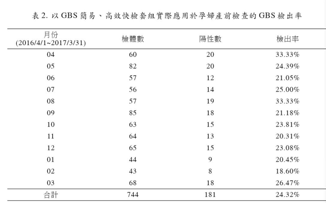 agar / GBS carrot agar 分隔平板)在12個月 間共評估744 個臨床產(chǎn)前檢查檢體,結(jié)果發(fā) 現(xiàn)孕婦的 GBS 檢出率(陽性率)為 24.32%