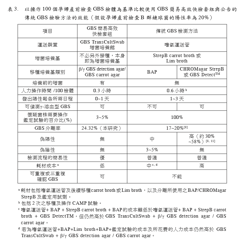 出率、報告時效、成本以及簡易性等項目皆 優(yōu)于公告的傳統(tǒng)GBS檢測方法。(表3)。
