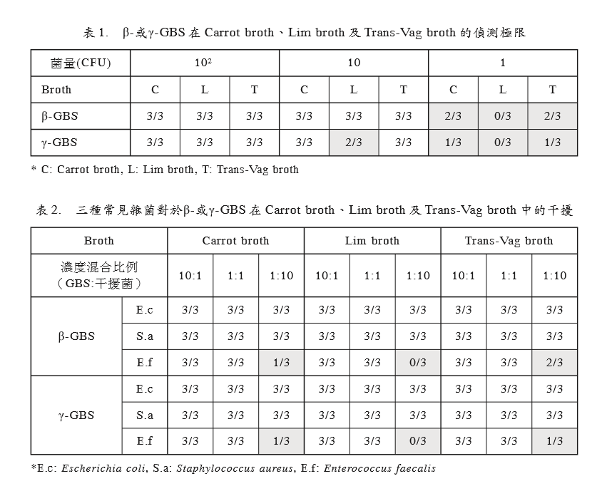 似,在Carrot broth、Lim broth及Trans-Vag broth 中,S. aureus 與 E.coli 并不會干擾 GBS的偵測,只有 -GBS與 E. faecalis以 1: 10混合才會影響到其偵測的能力,偵測率分 別為33.3% (1/3)、0% (0/3)及 33.3% (1/3) (表2)。