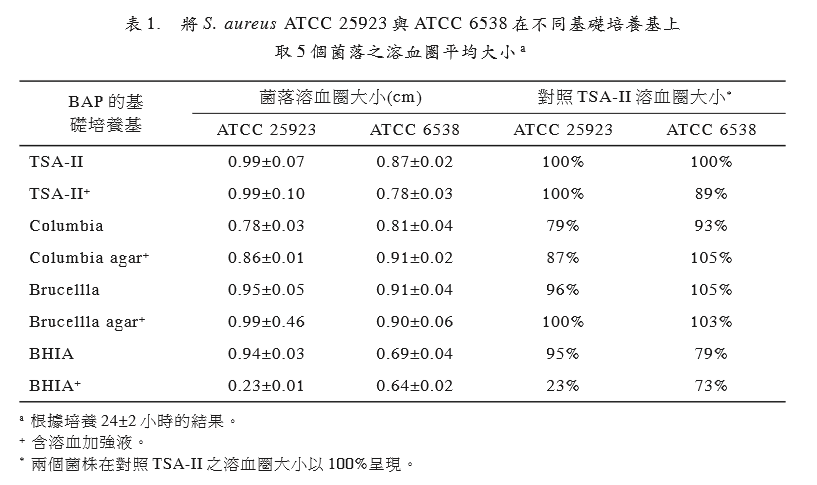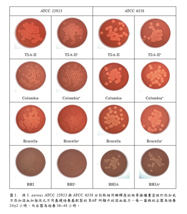 (TSA-II)、Columbia AgarBrucella Agar以 及brain heart infusion agar (BHIA),配制后 倒平板前,再添加5~10%綿羊血。其中,含 TSA-IIBAP用于培養(yǎng)一般常見(jiàn)的細(xì)菌及酵 母菌,含Columbia AgarBAP用于培養(yǎng)嗜 氧性與兼性厭氧菌以及絕對(duì)厭氧菌,含Brucella AgarBAP用于分離厭氧菌,而BHIA 則常用于分離真菌[5]。 在檢驗(yàn)室,不同鏈球菌常利用其生長(zhǎng)菌 落在BAP呈現(xiàn)的溶血型做為菌種或不同血清 群的初步鑒定依據(jù)[6],一般 溶血型B群鏈球 菌(Group B streptococci,GBS) BAP的生 長(zhǎng)菌落具有溶血性,但占約3~5%的 溶血型 B 群鏈球菌卻無(wú)法在BAP呈現(xiàn)明顯溶血性[7, 8],因此,需要含有溶血加強(qiáng)劑才能誘導(dǎo)不 溶血的 GBS 菌落產(chǎn)生 溶血,否則易導(dǎo)致其 漏檢[9]。由于臨床上S. aureus亦可能出現(xiàn)侏 儒變異株(dwarf variant),其對(duì)營(yíng)養(yǎng)需求較 高,在BAP上常形成微小的菌落,而且通常 不具 -溶血型[10, 11]。有鑒于此,本研究以添 加與不添加溶血加強(qiáng)液至含不同基礎(chǔ)培養(yǎng)基 (TSA-IIColumbia agar、Brucella agar BHIA)BAP探討是否會(huì)對(duì)S. aureus ATCC 25923 ATCC 6538溶血能力產(chǎn)生影響。