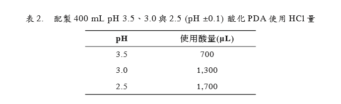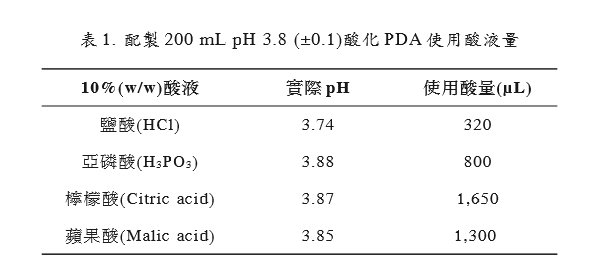 酸化馬鈴薯葡萄糖洋菜培養(yǎng)基(酸化 PDA) 制備 將 PDB 粉末加入總體積2% Agar,以 121℃高溫高壓滅菌15分鐘,冷卻至45-50℃, 加入先前制備好之酸液由pH 5.1調(diào)整pH至 3.8、3.5、3.0與 2.5。 酸化 PDA 配制方法經(jīng)預(yù)實(shí)驗(yàn)結(jié)果如表 1,不同酸液調(diào)整至pH 3.8 (±0.1)使用酸液量