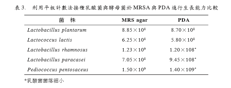 為評(píng)估乳酸菌于PDA之生長狀況,本研 究將乳酸菌活化后經(jīng)序列稀釋至適當(dāng)稀釋倍 數(shù)后以傾注培養(yǎng)于MRSA及PDA,結(jié)果如表 3 所示,乳酸菌以傾注平板法接種于 MRS agar 及 PDA,乳酸菌于兩種培養(yǎng)基皆可生 長,并且其菌落數(shù)目無明顯差異。乳酸菌于 MRSA培養(yǎng)基上生長活性較佳,菌落呈白色 明顯肉眼可見,但由于PDA是霉菌與酵母菌