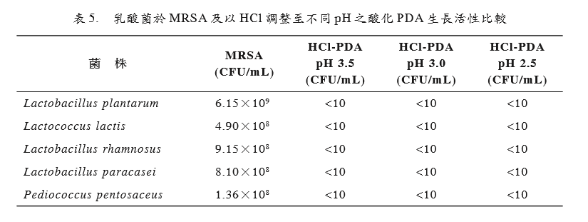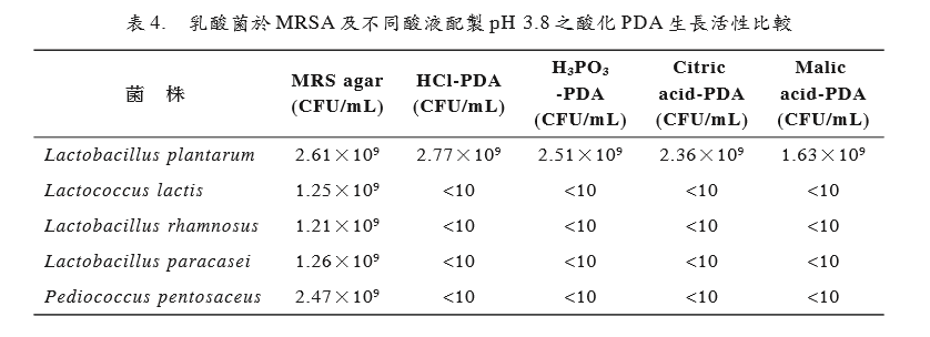 plantarum 較為耐酸,活性較強(qiáng),于 pH 3.8 之 PDA中菌數(shù)與MRS agar中菌數(shù)無明顯差 異。 以不同酸液調(diào)整pH值之PDA皆可抑制 大部份乳酸菌的生長(表4)。以此結(jié)果可 推斷以調(diào)整 pH 方式可以抑制乳酸菌生長活 性,以 pH 值 3.8之 PDA 雖然可降低大部分