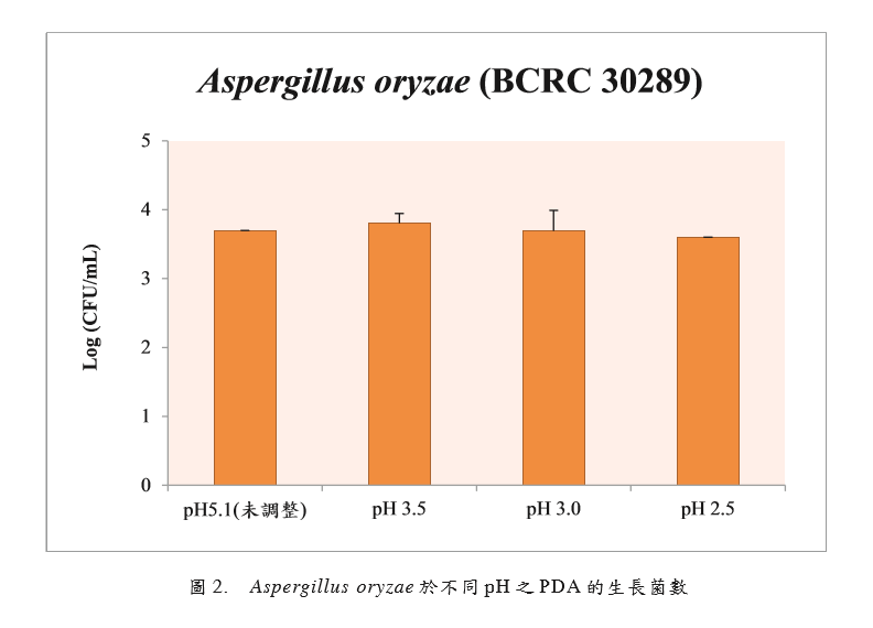 根據(jù)表4 結(jié)果顯示,由各種酸液調(diào)整pH 之PDA對(duì)于L. plantarum生長活性無顯著差 異,為了改進(jìn)此缺點(diǎn),后續(xù)實(shí)驗(yàn)使用實(shí)驗(yàn)室 內(nèi)最常見之酸液(鹽酸)制備酸化PDA,再 由上述實(shí)驗(yàn)結(jié)果改良實(shí)驗(yàn)方法,以10% 鹽酸 酸液調(diào)整 PDA 之 pH,由原始 pH5.1調(diào)整至 pH 3.5、3.0、2.5。各乳酸菌接種至 MRS Broth 37℃培養(yǎng)16~18小時(shí),再以MRS agar 傾注培養(yǎng)37℃2-3天,同時(shí)以不同pH之PDA 傾注培養(yǎng)25℃5-7天,培養(yǎng)后觀察結(jié)果如表 5。將活性乳酸菌傾注培養(yǎng)于 pH 3.5、3.0、 2.5之 PDA 中,各乳酸菌皆無法生長,證明 降低pH值可以抑制乳酸菌活性。 為了確認(rèn)真菌生長活性不受高酸性環(huán)境 影響,本研究將霉菌與酵母菌以傾注法培養(yǎng) 于不同 pH 之 PDA 平板,再以25℃培養(yǎng)5-7 天,觀察其生長情形,結(jié)果如圖1、圖2 所 示,代表霉菌的Aspergillus oryzae與代表酵 母菌的 Saccharomyces cerevisiae 皆可于低 pH之PDA平板生長,由此可知低pH 之PDA 霉菌與酵母菌亦可生長,觀察酸化PDA平板 生長之菌落型態(tài)與未調(diào)整pH之 PDA并無差 異,生長活性亦無明顯差別,將PDA酸化可 大幅降低乳酸菌在PDA中檢出機(jī)率,且不影 響霉菌與酵母菌檢測,進(jìn)而降低檢測報(bào)告之 偽陽性。