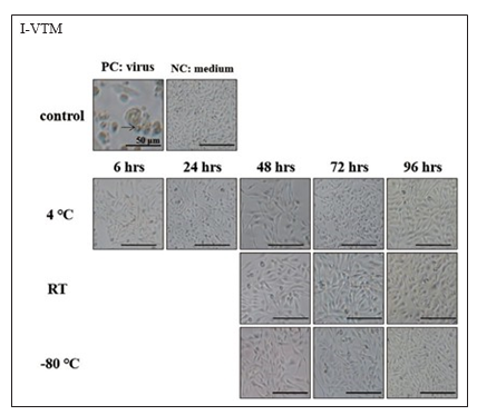 圖中包括含陽性控制組(PC: virus)、陰性控制組(NC: medium)與實驗組(4C、RT -80C)之細胞形態(tài)。顯微鏡 (200x)觀察。(A) VTM 的陰性控制組顯示細胞完整,無細胞病變(CPE);陽性控制組與實驗組在所有溫度及時間下 皆發(fā)現(xiàn) CPE:細胞呈現(xiàn)皺縮、變圓、出現(xiàn)空泡、凝聚、和脫落等現(xiàn)象(箭頭)。(B) I-VTM 的陰性控制組與實驗組 細胞皆無 CPE,而陽性控制組則有 CPE。