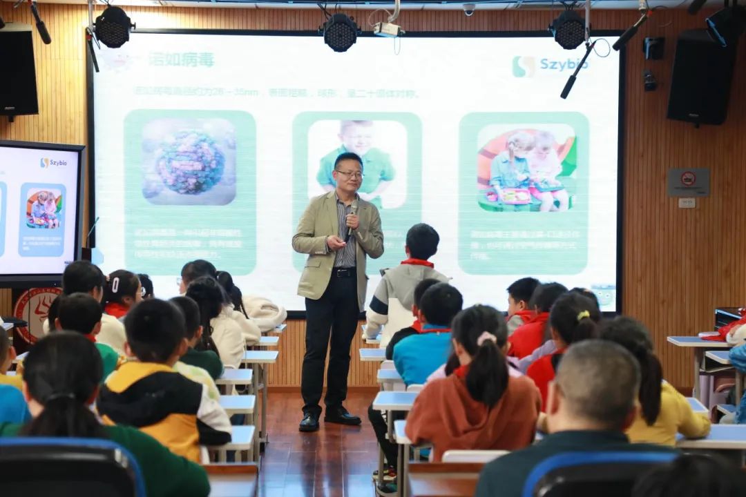 華權(quán)高以病毒的起源為切入點(diǎn),用幽默風(fēng)趣的語言、生動(dòng)形象的方式,從什么是病毒、身邊有哪些常見病毒、為什么要檢測病毒、怎么檢測病毒、生活中如何預(yù)防病毒感染、科學(xué)家在病毒檢測中做了哪些貢獻(xiàn)六個(gè)方面,為同學(xué)們講解了病毒相關(guān)知識(shí)。