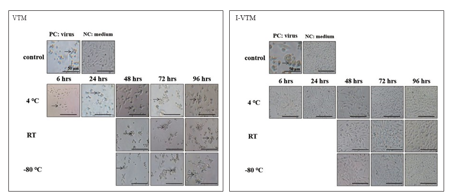 皆發(fā)現(xiàn) CPE:細(xì)胞呈現(xiàn)皺縮、變圓、出現(xiàn)空泡、凝聚、和脫落等現(xiàn)象(箭頭)。(B) I-VTM 的陰性控制組與實(shí)驗(yàn)組 細(xì)胞皆無(wú) CPE,而陽(yáng)性控制組則有 CPE。